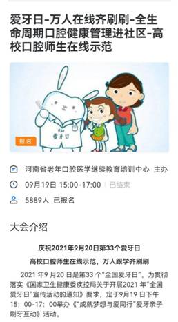 2021年9月20日是第33个“全国爱牙日”, 19日下午14:00开始热场,在郑州大学口腔医学院秦红霞教授主持下,全省开办口腔医学专业的多数院校师生依次登场。在口腔医学教学团队集思广益、共同协助下,耿瑶老师代表我校做主播,她利用刷牙模型、模拟婴儿、刷牙指套、儿童牙刷等道具,还邀请了几位学龄前小朋友做嘉宾,生动形象、耐心细致、浅显易懂地,从专业角度为在线观众示范了婴幼儿口腔清洁方法、学龄前儿童的刷牙方法,还对刷牙及牙科用品使用方面的常见错误做法,进行了纠正。在线网友夸耿老师“这个老师讲得真好!”活动主办方评论“南阳医专演示专业完美!”