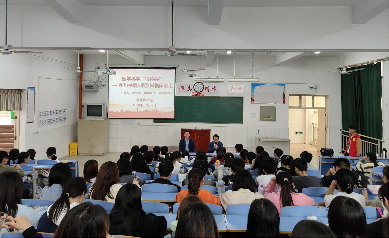 2023年10月25日下午,临床医学系在四号教学楼201教室开展了《医学科学“特种兵”—消化内镜技术及其临床应用》专题讲座,邀请南阳市知名消化内科专家、主任医师、教授库建伟主讲。2022级临床医学专业学生代表150余人参加,讲座由临床医学系党总支书记宗山林主持。