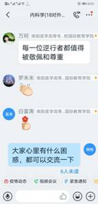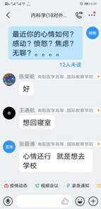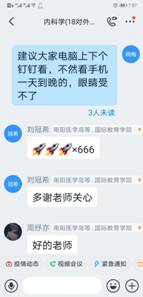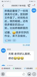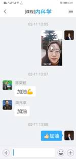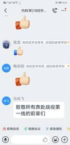 在“学习通”平台建课时,在所有专业知识点开始之前,她给同学们用振奋向上的视频制作“开学第一课”。第一次上课时,讲完了内科学绪论后,用身边同学、自己爱人王雷舍身投入抗“疫”的故事鼓舞启发学生、感动学生。