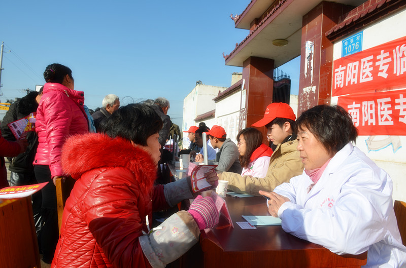本次义诊活动在均张村村委前的小广场进行。服务队一到现场,就受到了等候在现场的周围十几个村庄居民热烈欢迎。服务队中的专家一方面对前来就诊的村民进行诊断,尽力减轻患者疾痛,特别是颈肩腰腿痛的患者,在经疼痛专家郑新安医生徒手治疗后,疼痛立刻减轻了,肢体运动得到恢复,村民们对中医治疗感觉很神奇;另一方面根据当地居民的地多发病、常见病实际情况,为村民进行医疗保健预防知识的讲解,提高村民的医疗卫生意识。其他服务队的成员也积极参与到义诊活动中,为老乡们进行血压测量等体检活动,免费发放卫生知识宣传单,保健预防知识扑克牌等。义诊现场人头涌动,前来就诊的村民们纷纷对服务队成员表示感谢,对能在家门口就享受到南阳医专二附院专家的服务感觉非常高兴。他们纷纷表示,希望我校多举办此类活动,使更多有疾病的村民能够受到专家的诊治。