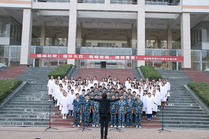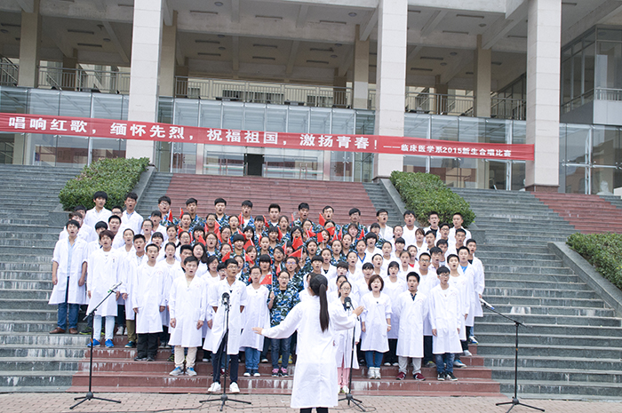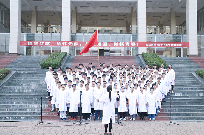 为了纪念法西斯战争胜利70周年,欢庆祖国的66岁生日,深入贯彻落实社会主义核心价值观,展现当代大学生团结向上的精神风貌。2015年9月29日下午,临床医学系在校图书馆前举行以“唱响红歌,缅怀先烈,祝福祖国,激扬青春“为主题的歌咏比赛。出席本次活动的有校宣传部部长王永科,校学工办主任、学生处处长孟晓红等,2015级所有新生、辅导员、班主任均参与其中,系领导班子及部分辅导员担任评委。