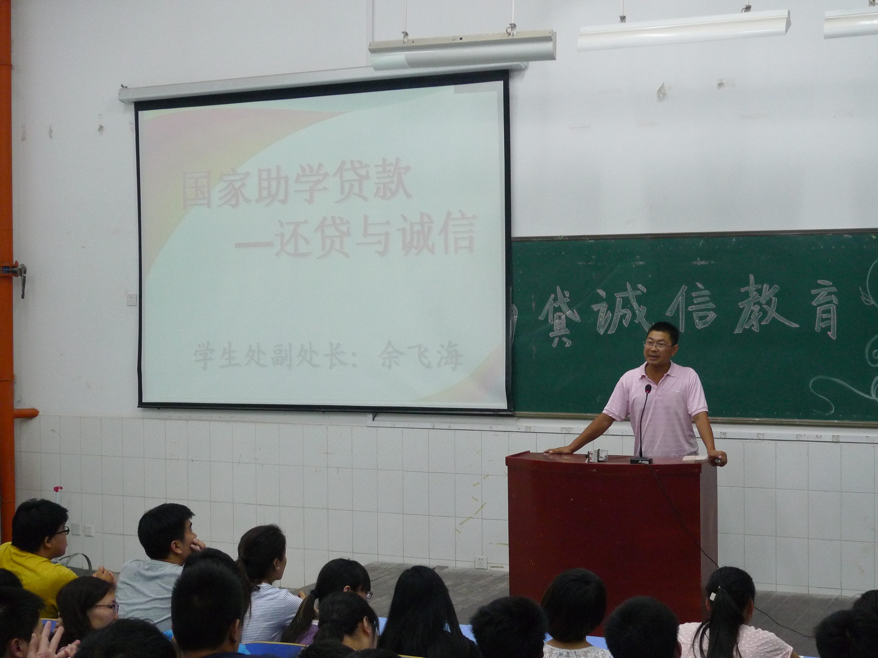 5月2日我系邀请到校学工部副处长余飞海和资助中心王赟老师来系开展2015届贷款毕业生、实习生国家助学贷款诚信教育及还款指南专场培训会。系学工办主任邢献昆及全系贷款毕业生和实习生参加了培训会。