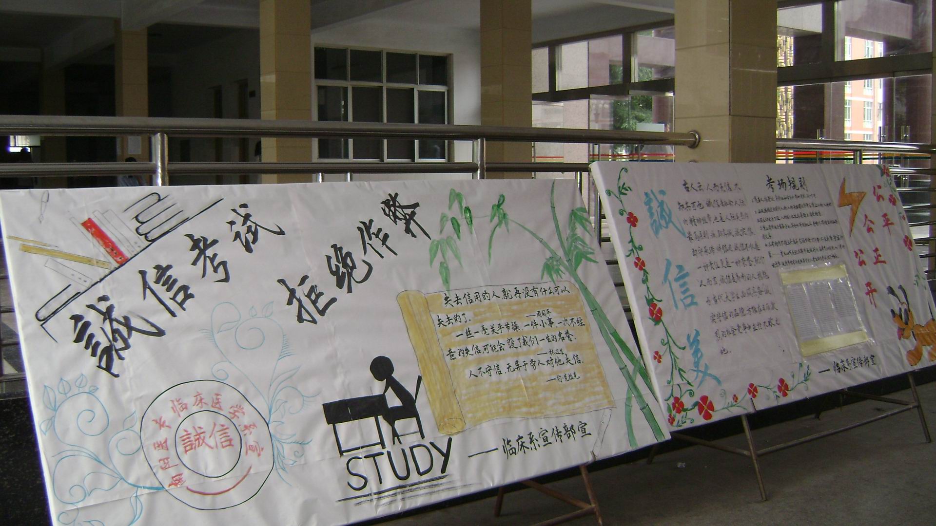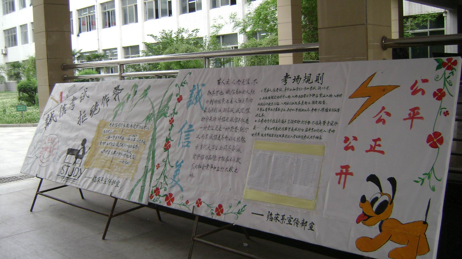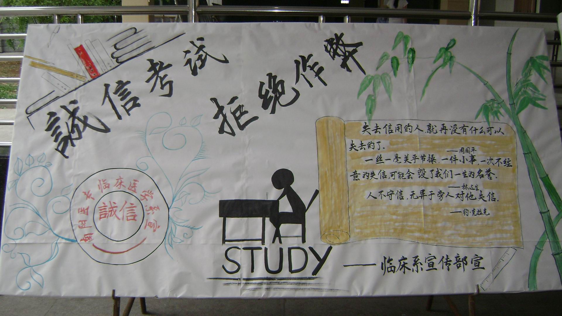 6月14日,临床医学系即召开辅导员、班主任工作会议。会议要求把学生工作的重心转移到引导学生复习备考,教育学生诚信应试上来。系内专门制作了四块诚信教育宣传板面分别在主、东两个校区展出,内容既包括谨守诚信的引导,又有几年来该系因违反考纪而受到处分的警示。按照统一部署,当天晚上,全系33个在校班级分别举办了“诚信考试,诚信人生”的主题班会。辅导员引导同学们充分认识诚信是个人必备品质、诚信是社会发展的必需、诚信是公平公正的前提,诚信是大学生成才的基本素养后,各班学生纷纷发言,表示要诚信考试,决不舞弊,以实际行动营造风清气正、博学上进的大学氛围。
