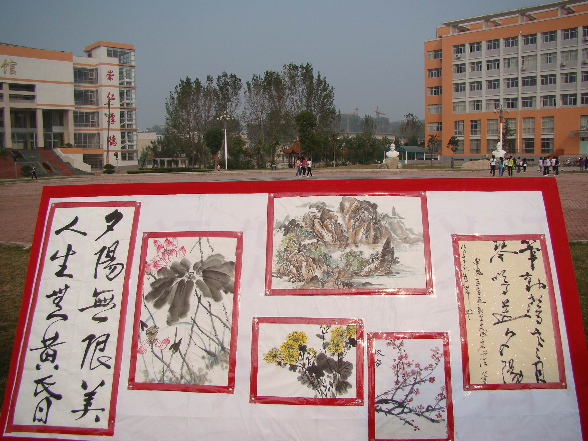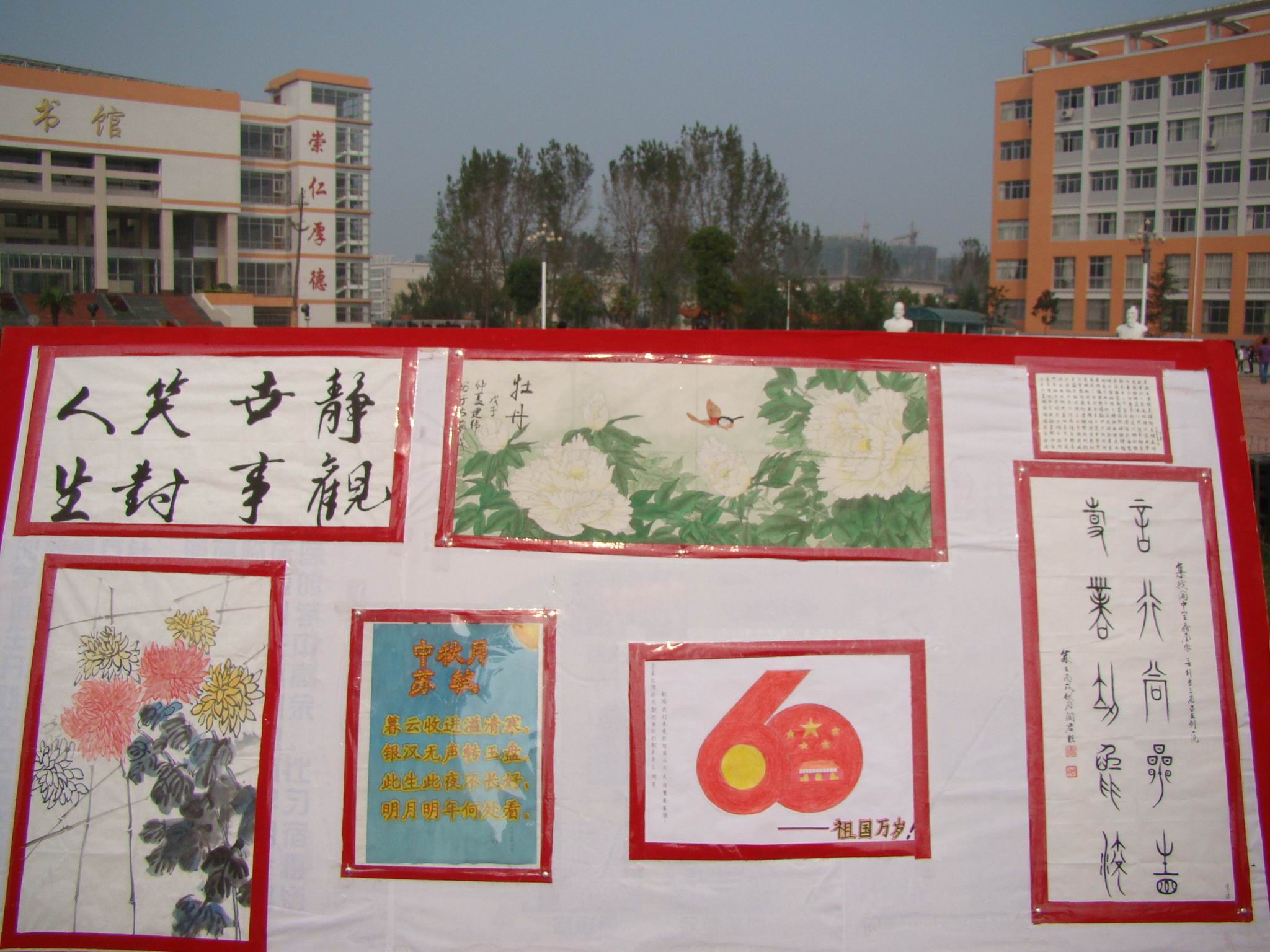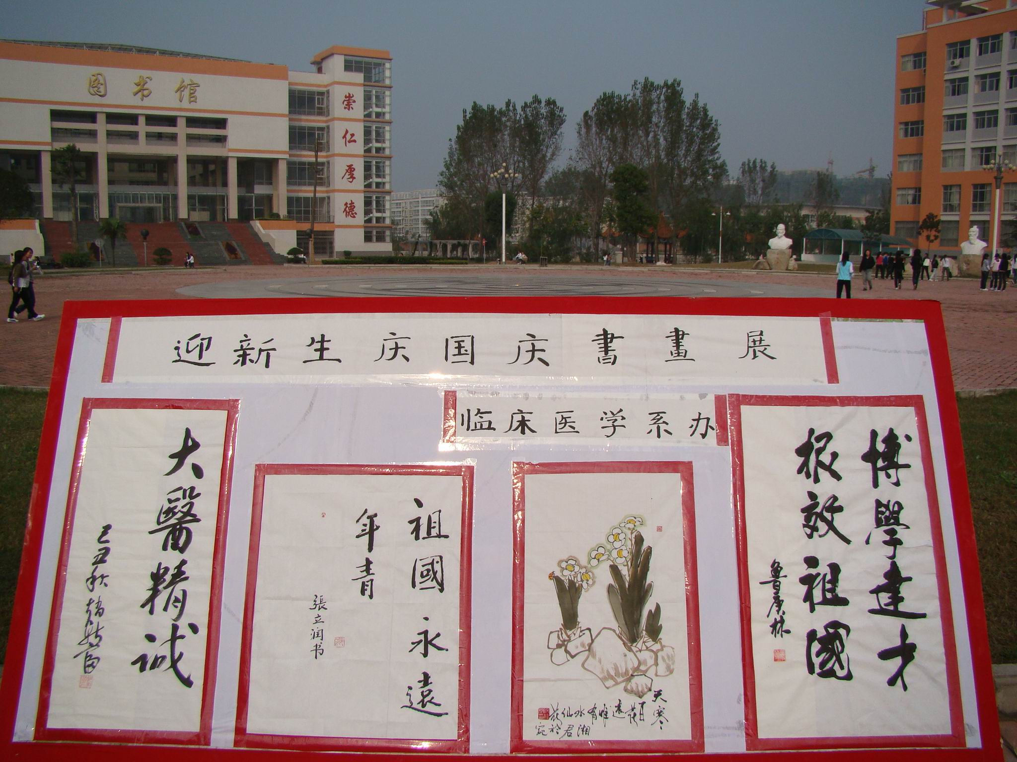 在祖国60华诞来临之际,9月28日,我校临床医学系团总支举办的“迎新生庆国庆书画展”在主校区图书馆前广场上隆重展出。