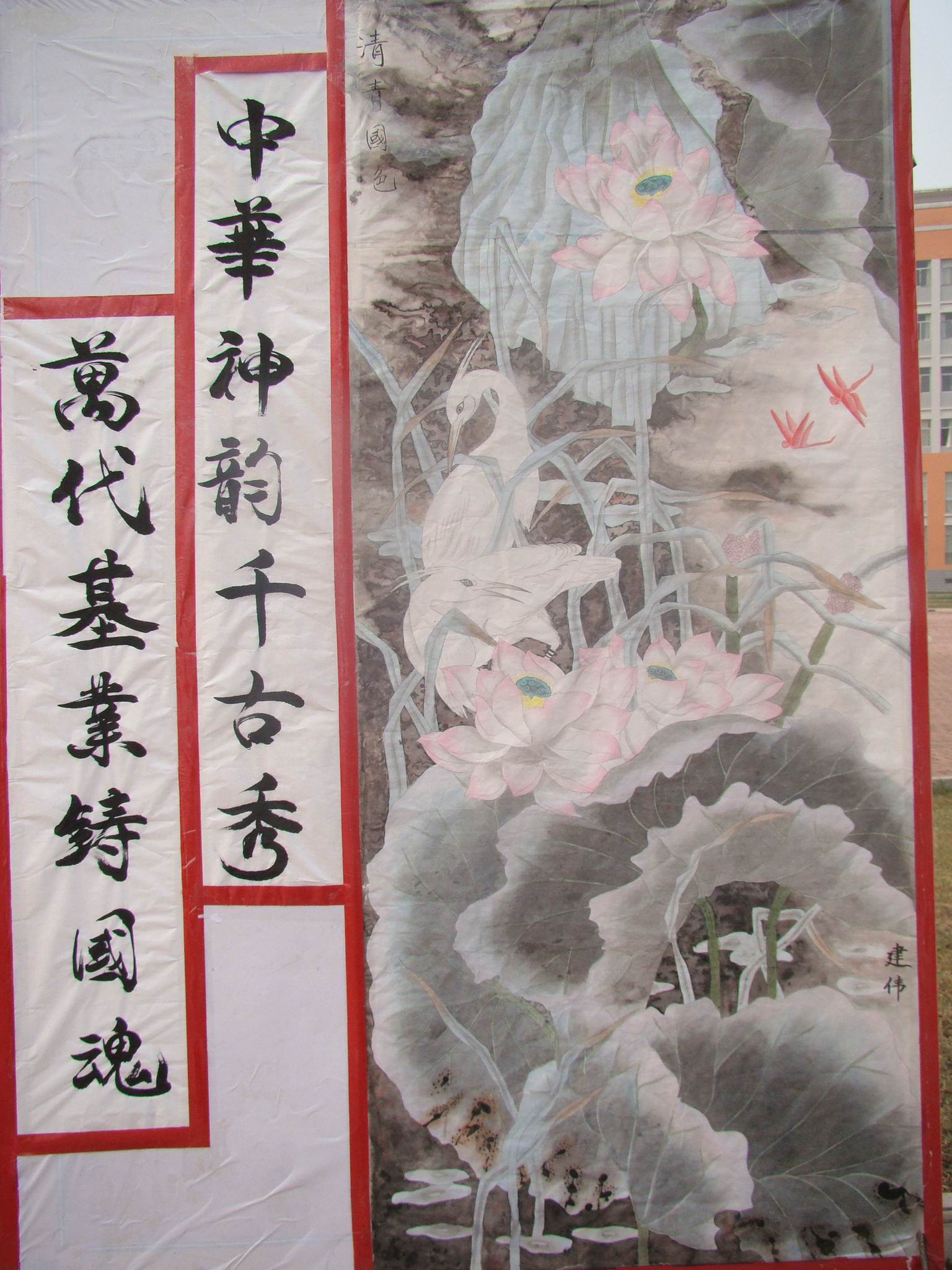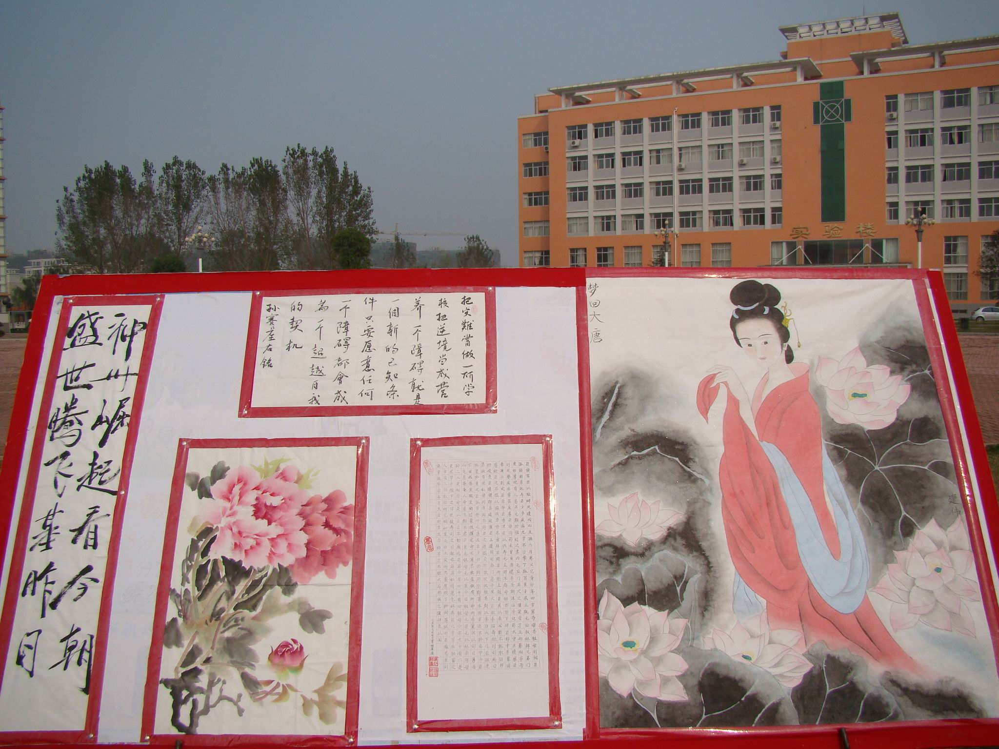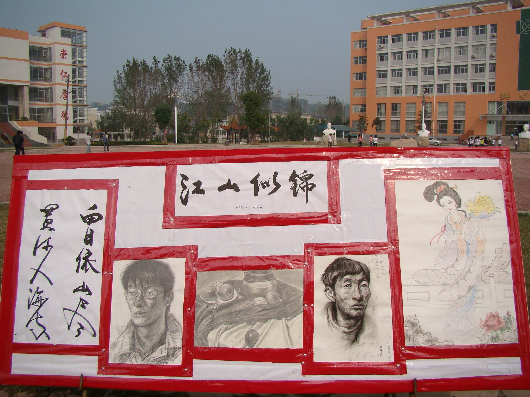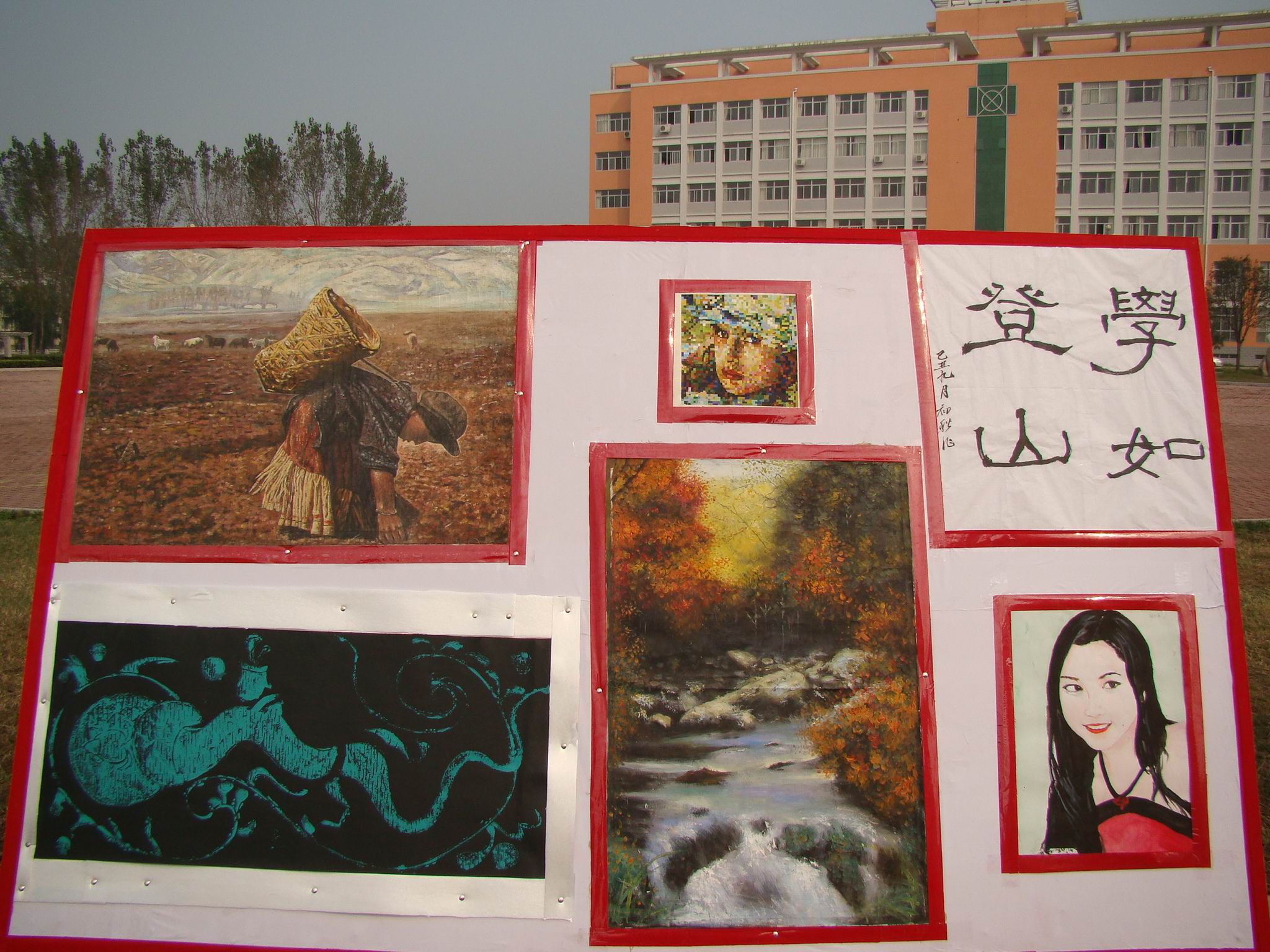 在祖国60华诞来临之际,9月28日,我校临床医学系团总支举办的“迎新生庆国庆书画展”在主校区图书馆前广场上隆重展出。