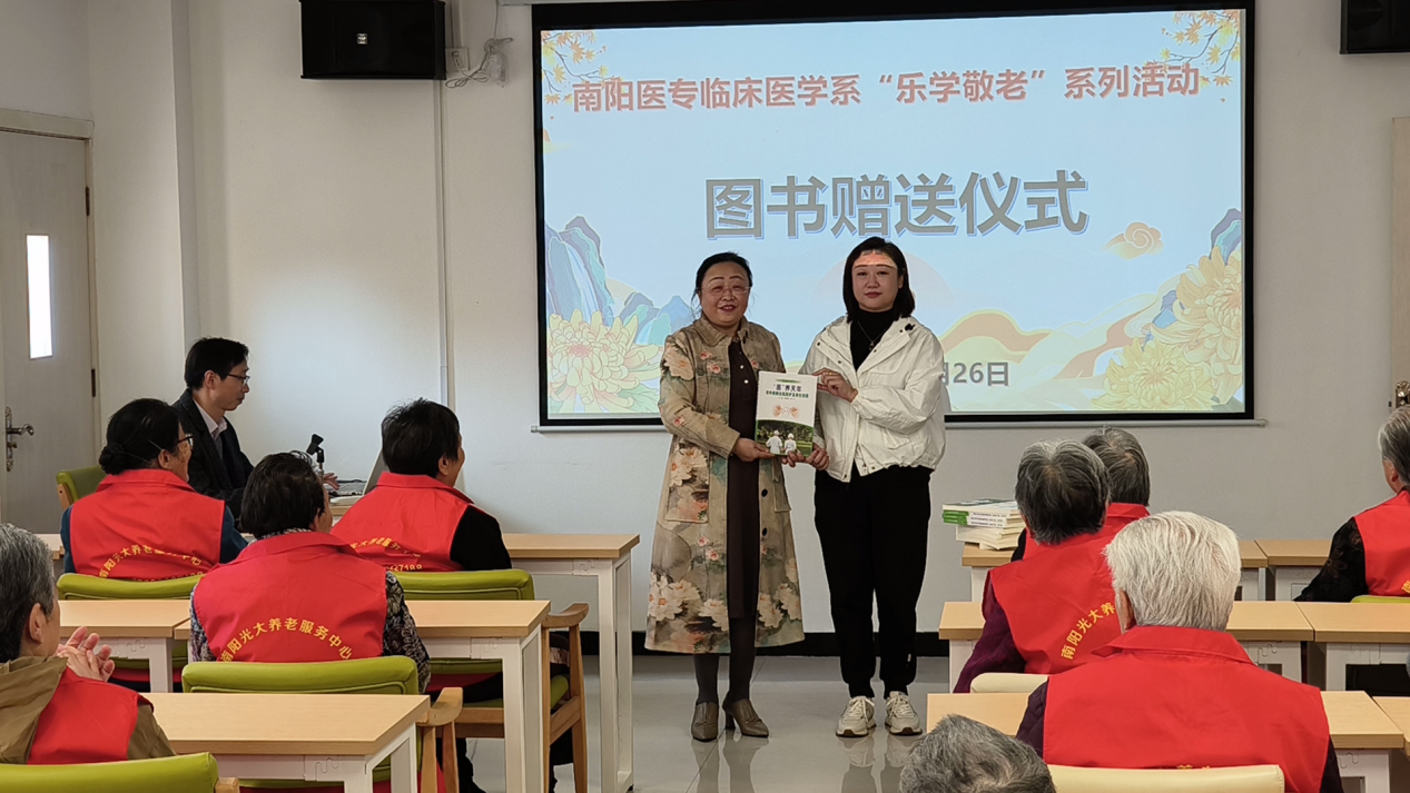 岁月不饶人,老年人记忆力下降是不争的事实。临床医学系主任李玲把自己主编的老年科普读物《“医”养天年——老年疾病自我防护及养生技能》赠送与光大养老服务中心,以丰富老年人的业余生活,将医学科普知识无声的传递到每一位老人的心中。最后,临床医学系的师生为现场的老人进行义诊,通过专业的手法为老人们舒筋解乏,受到老人们的充分肯定和高度赞扬。