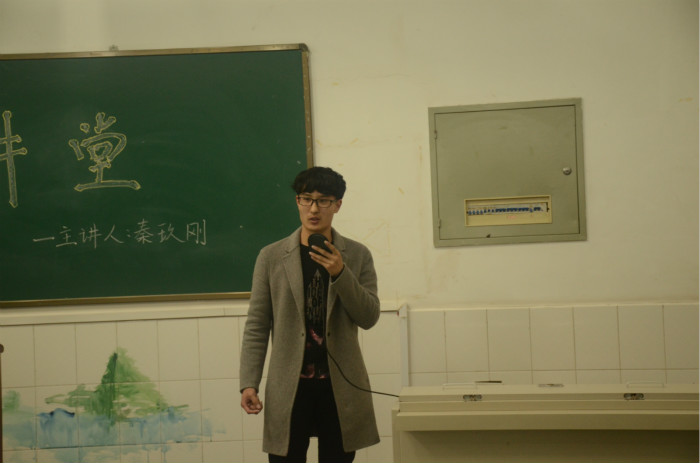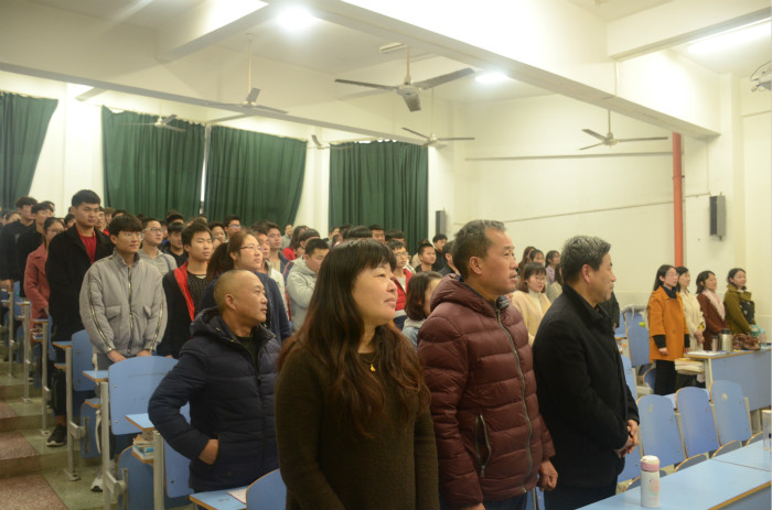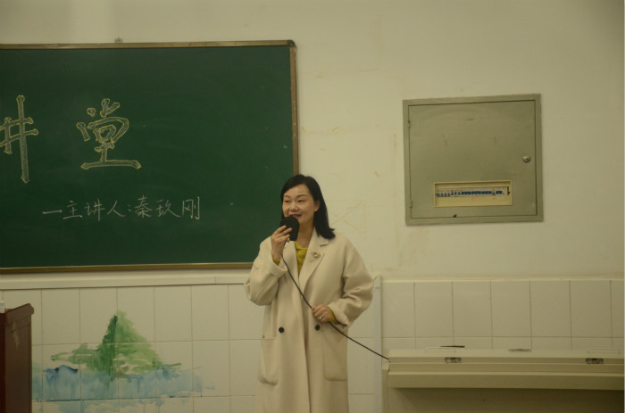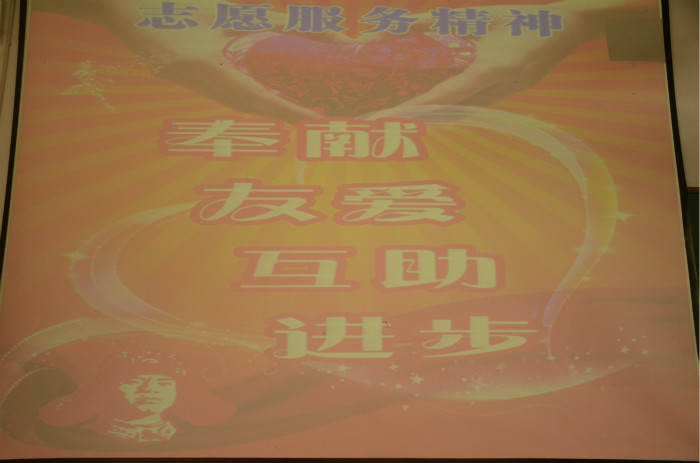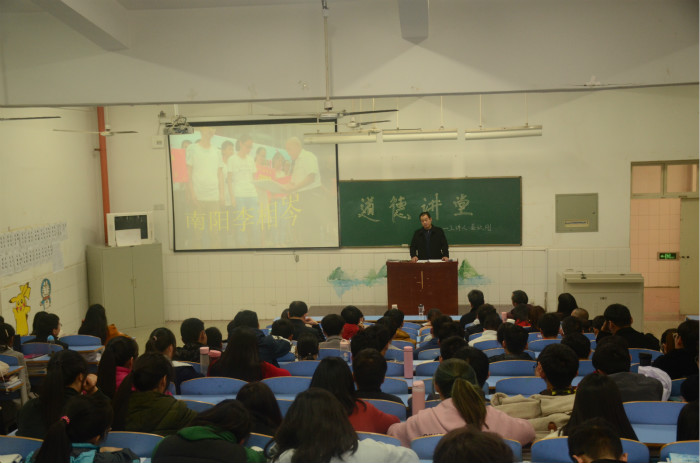 秦书记首先带领大家合唱了歌曲《爱的奉献》。秦书记讲述了南阳社区志愿者协会会长李相岑的事迹。李相岑从事公益事业,源自一场意外的车祸,当他作为无名施救者把受伤司机送到医院,使伤者得到了及时救治时,体会到了行善助人的快乐。从此,救危助弱,投身公益,一发不可收拾,被人们称赞为新时期的“活雷锋”,先后荣获“全国五一劳动奖章”、“河南省十大杰出志愿者”等荣誉称号。这位从少年到壮年把雷锋行为和精神完全融入生命的爱心志愿者的事迹,使在场师生深受感动和激励。