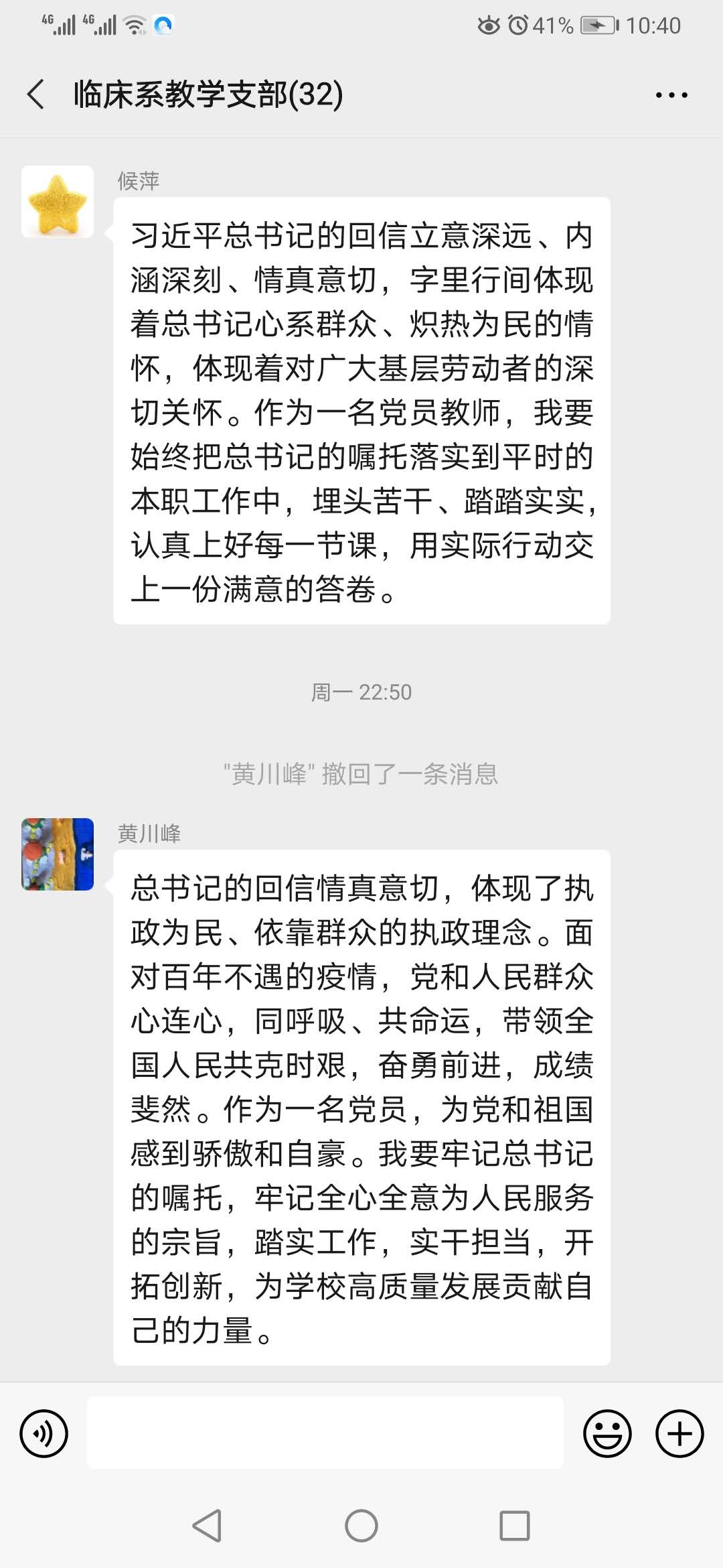 学习习近平总书记回信精神,争当出彩先锋。为进一步深入学习贯彻习近平总书记给郑州圆方集团职工重要回信精神,6月22日,临床医学系教学支部和学管支部分别开展了“弘扬劳动精神、争当出彩先锋”主题党日活动。活动中,学管支部书记张立润向与会教师党员和学生党员简单介绍了远方集团事迹,对我系积极参与疫情防控工作的40余名学生党员进行了表彰,寄语学生党员要继续努力,主动到边疆、基层,到祖国、人民需要的地方,学以致用,践行入党誓言。教学支部书记黄川锋号召全体教师党员通过“学、议、做”,深入领会贯彻回信精神,实干担当。