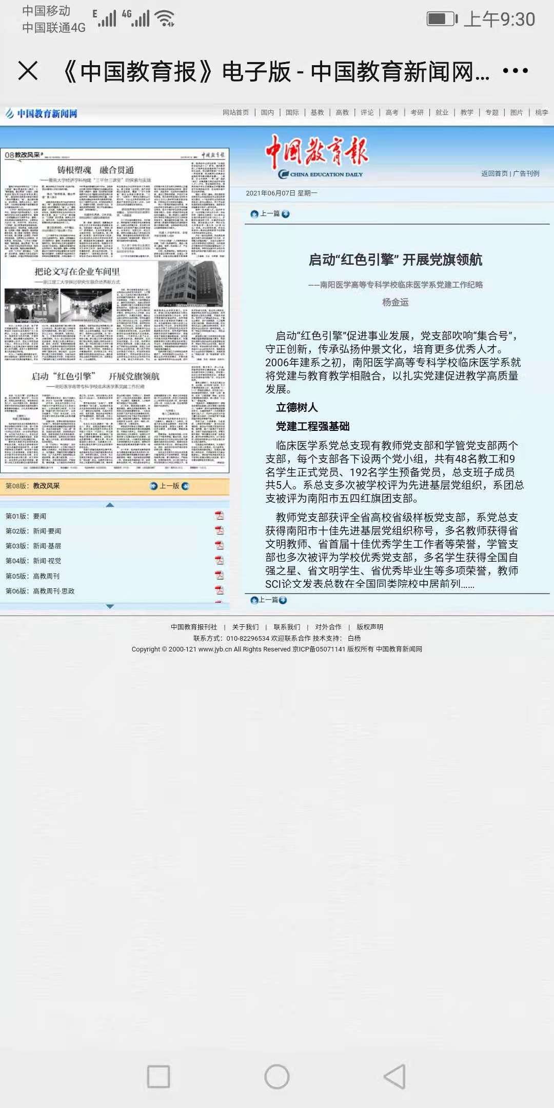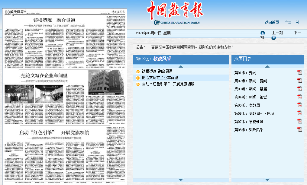 2021年6月7日出版的《中国教育报电子版》以《启动“红色引擎”开展党旗领航》为题对我系党建工作进行了报道。