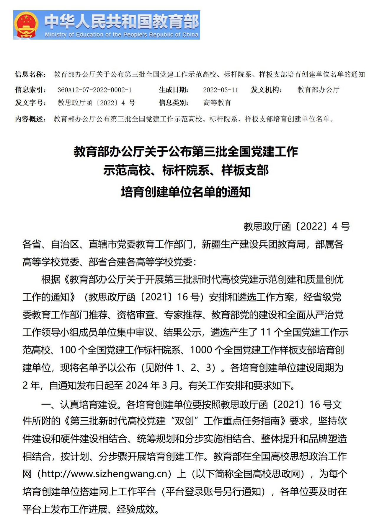 本次评选,是根据《教育部办公厅关于开展第三批新时代高校党建示范创建和质量创优工作的通知》(教思政厅函〔2021〕16 号)安排和遴选工作方案,经省级党委教育工作部门推荐、教育部党的建设和全面从严治党工作领导小组集中审议,遴选产生了1000个全国党建工作样板支部培育创建单位。各培育创建单位建设周期为2 年,实行动态管理,建设期满教育部组织验收。