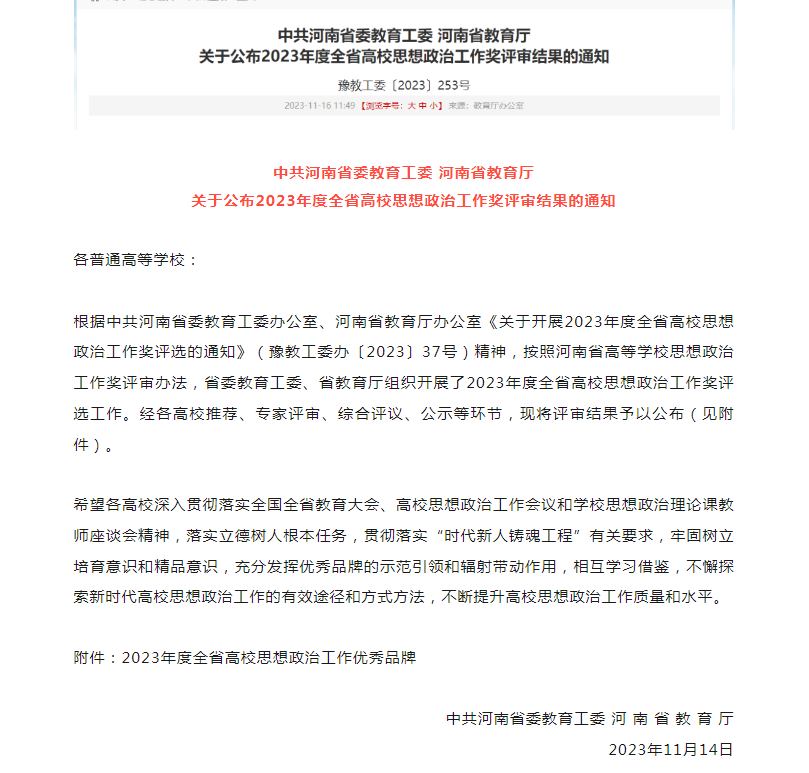 (文/王静)近日,中共河南省委教育工委、河南省教育厅下发《关于公布2023年度全省高校思想政治工作奖评审结果的通知》,我校临床医学系申报的《“仲景名师”医路行》思政项目被评为2023年度河南省高校思想政治工作优秀品牌。