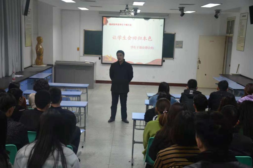 2018年11月22日下午4点,临床医学系学生会于四号教学楼2204教室召开了会议,组织我系学生会干部学习《学生会干部自律公约》条例并签订承诺书。系学工办主任邢献昆及我系学生干部60余人参加学习。