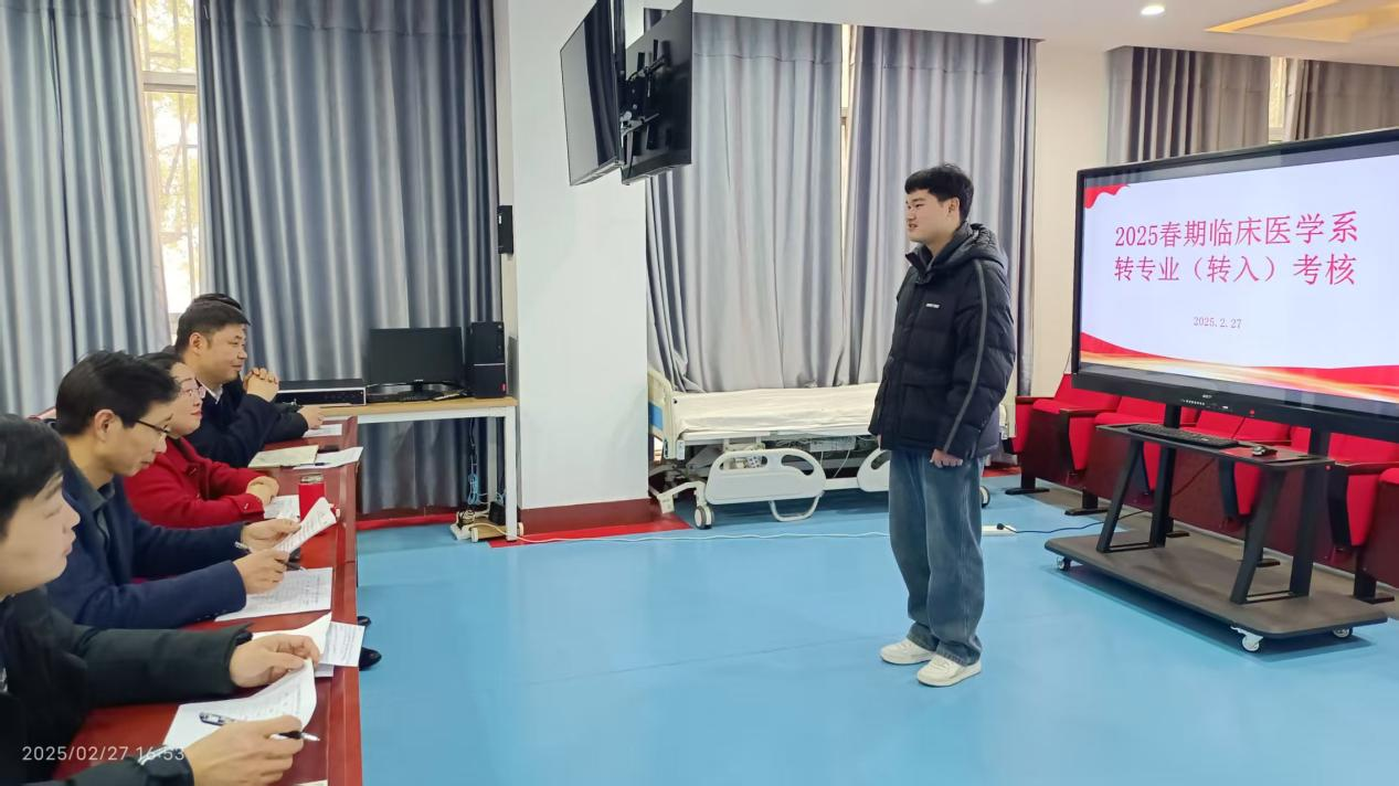 2025年2月27日下午,临床医学系在模拟训练中心开展2025年春期转专业考核工作。临床医学系党总支书记张辉、系主任李玲、副书记王川、副主任周毕军、学工办主任张政、模拟中心主任侯萍、辅导员王桂春以及专任教师郑璞共同担任此次考核的评委。