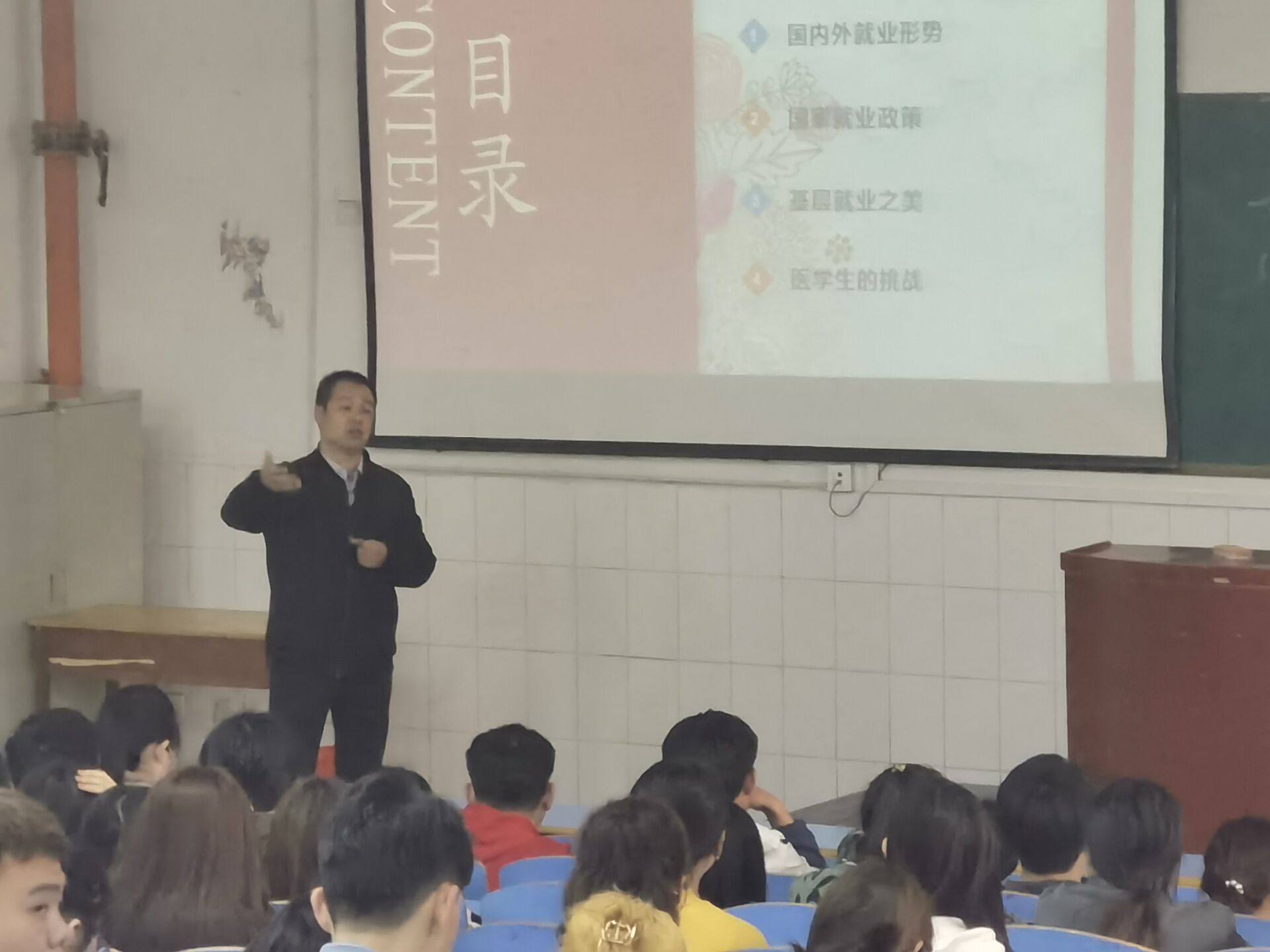 面对严峻的就业形势,为加强学生的就业指导,树立正确的就业观念。2021年4月7日下午临床医学系在四号教学楼501教室举行了就业形势与政策系列指导讲座。本次讲座由系党总支书记秦玖刚主讲,19级近200名学生代表参加。